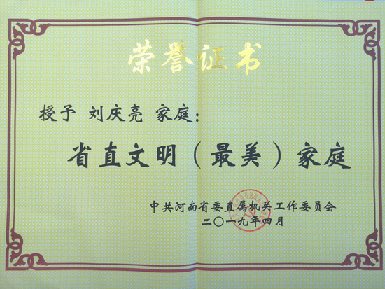 日前,由省委直屬機關工委開展的第一屆"省直文明(最美)家庭"活動結果揭曉,我公司劉慶亮家庭榮獲"省直文明(最美)家庭"稱號。