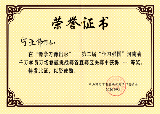 9月9日上午,省委直屬機(jī)關(guān)工委舉辦的"豫學(xué)習(xí)豫出彩"--第二屆"學(xué)習(xí)強(qiáng)國(guó)"河南省千萬(wàn)學(xué)員萬(wàn)場(chǎng)答題挑戰(zhàn)賽省直賽區(qū)決賽舉行,94名省直和中央駐豫單位"學(xué)習(xí)達(dá)人"現(xiàn)場(chǎng)展開(kāi)"知識(shí)對(duì)決"。公司環(huán)境院青年黨員寧亞偉代表黃委參賽,以通關(guān)成績(jī)榮獲一等獎(jiǎng)。
